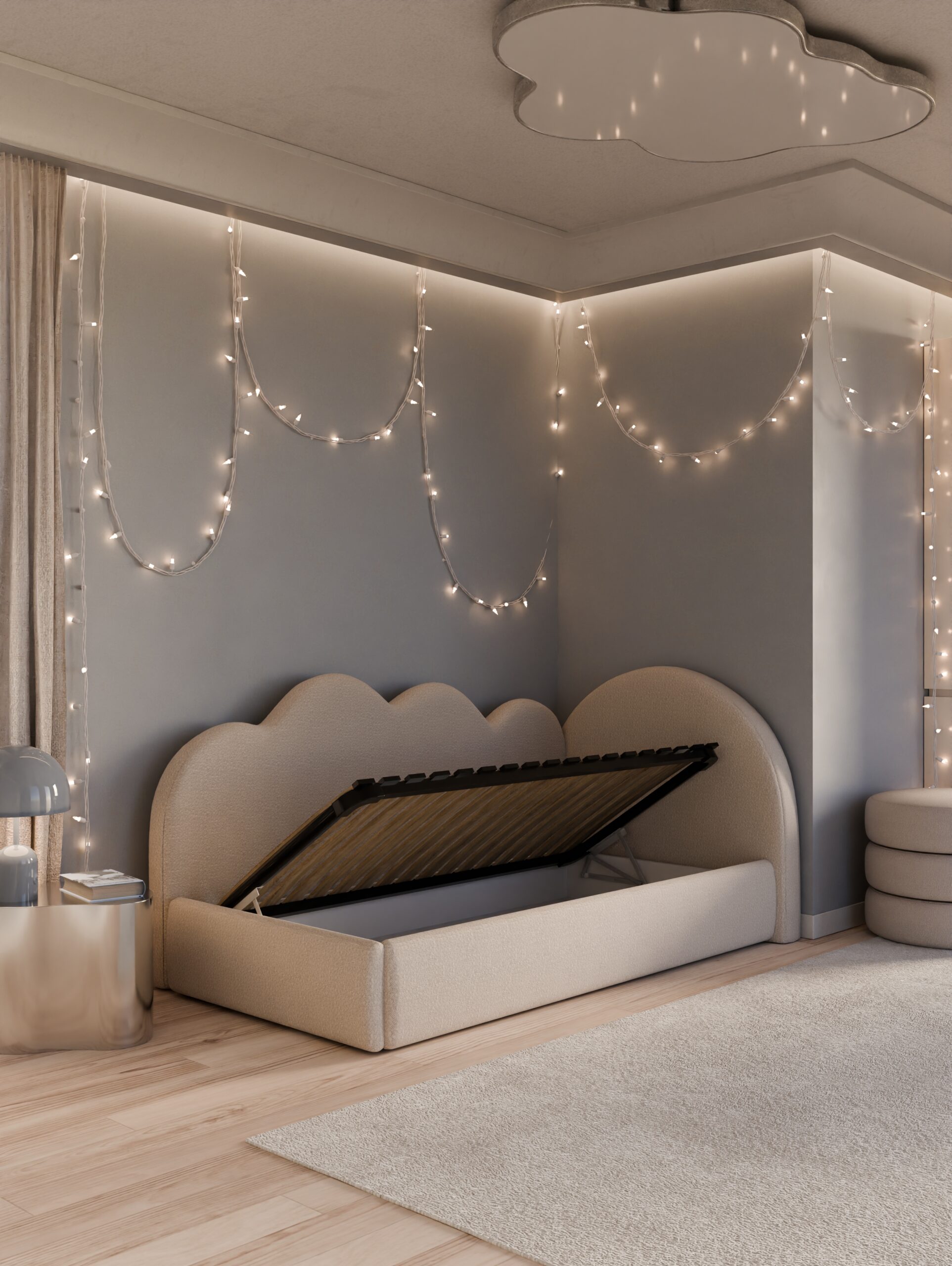 Pojedyncze łóżeczko „Chmurka” to klasyczna wersja naszego bestsellerowego modelu – zaprojektowana z myślą o codziennym komforcie dziecka i wygodzie rodziców. Konstrukcja z wysokim zagłówkiem w kształcie chmurki nadaje wnętrzu bajkowego charakteru, a pojemnik pod łóżkiem zapewnia praktyczne miejsce do przechowywania.